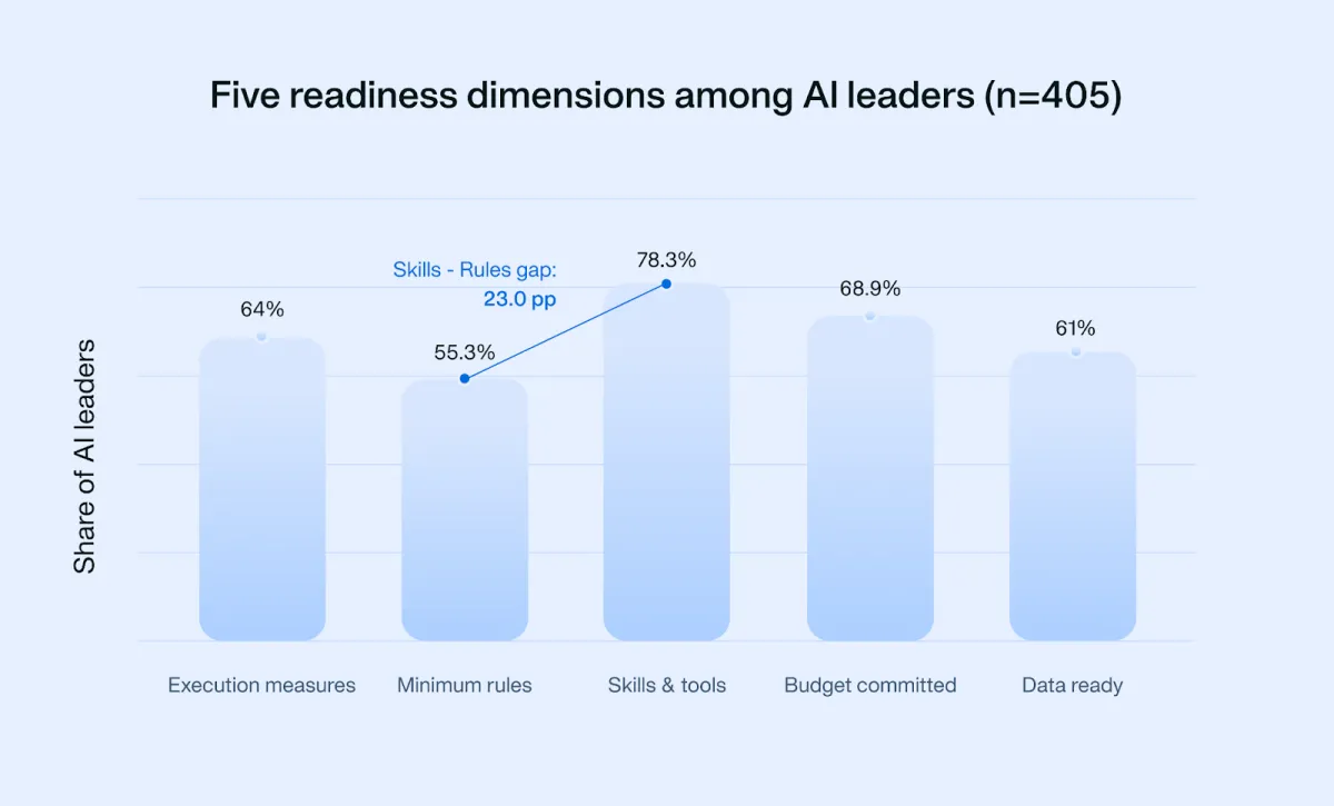 Responses were weaker on minimum rules and data readiness. The research found that 32% of AI leaders had skills but lacked minimum rules for safer use, while 22% reported AI measures but still lacked minimum rules to scale consistently.